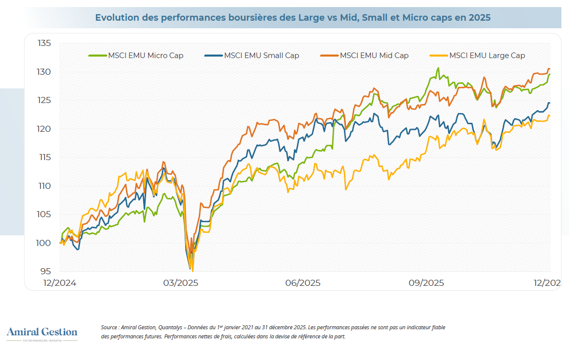 L’évolution comparée des performances en 2025 montre que la lecture opposant mécaniquement grandes et petites capitalisations est réductrice. Si les large caps européennes ont bénéficié de flux importants et d’une forte concentration sur quelques thématiques dominantes, les segments mid, small et micro caps ont également affiché des trajectoires positives, au prix d’une volatilité plus marquée.