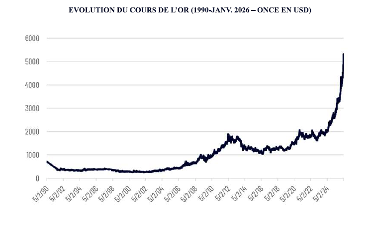 Evolution du cours de l’or (1990-Janv. 2026 – ONCE en usd)
