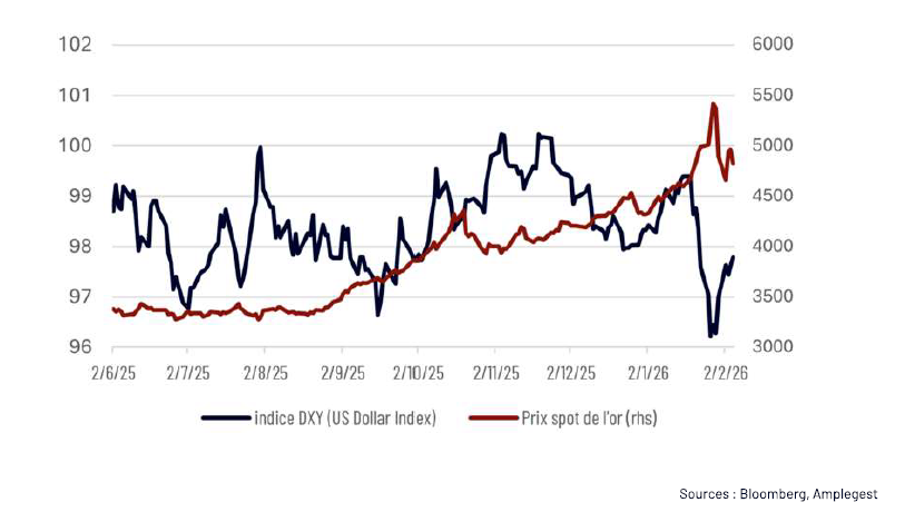Sans doute aurait-on pu titrer : « le décrochage de l’or, prix de l’orthodoxie monétaire », dans la mesure où la première phase de cette séquence et son corolaire immédiat de rebond de l’USD sur le marché des changes (cf. graphique ci-dessous) peut se donner à comprendre comme le débouclage de positions/proxy short USD suite à la proposition d’un spécialiste, connu pour être un faucon, aussi favorable au respect strict des cibles d’inflation que critique de l’interventionnisme hétérodoxe des banques centrales au poste de Président de Réserve fédérale, par le locataire de la Maison blanche (nous reviendrons sur ce pré-diagnostic posé par les marchés à propos de la personne de Kevin Warsh dans notre prochaine publication, hors événement majeur de marché).