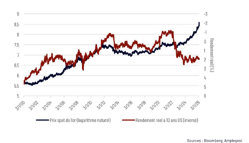 Mais le rebond rapide du précieux métal tout autant que l’observation de son évolution de long terme, tend à montrer que cet événement (aussi spectaculaire que fût sa réception par les marchés) n’est pas de nature à remettre en cause un mouvement plus long, auquel certains ont prêté le nom de « debasement », dont témoigne en particulier la rupture de la trajectoire historique d’évolution de l’or en fonction des taux d’intérêts réels (US) reprise dans le graphique ci-dessous (la rationalité classique voulant que le coût d’opportunité de la détention d’or s’accroisse avec l’augmentation des taux d’intérêts réels dans la mesure où l’or est un actif improductif).