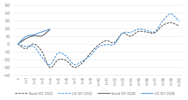 - plutôt que de renforcer l’appétit des allocataires pour les souverains, a affermi l’ensemble de leurs scénarios hawkish en termes de taux (limitant plus encore leurs anticipations de baisses de taux à court terme)