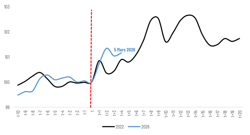 L’isolement de la République islamique iranienne sur la scène internationale, l’affaiblissement de ce qu’il est de coutume d’appeler ses proxys sur le plan régional, et la faiblesse de leurs moyens militaires par rapport à ceux du couple israélo-américain sont de nature à conforter le scénario d’un conflit de durée très limitée. Mais, pour reprendre les propos d’Emile de Girardin, la guerre est (malheureusement) plus facile à déclarer que la paix n’est facile à organiser. Et compte tenu du péril existentiel auquel est confronté le brutal régime iranien, poser l’hypothèse que le chemin qui nous sépare du silence des armes ne sera pas pavé de destructions d’infrastructures pétrolières cruciales pour la stabilité des cours mondiaux du pétrole nous semble une hypothèse particulièrement forte. Deux arguments qui nous portent à poser l’hypothèse que la « furie épique » israélo-américaine est de nature à accroître durablement la volatilité (sous-jacente) des marchés.