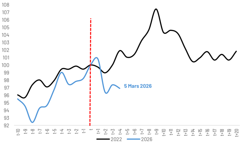 - s’il a permis de confirmer la prééminence de l’USD et son exceptionnalité pour le système financier mondial, n’en a pas moins mis à jour quelques signes d’affaiblissement progressif de ces logiques. De fait, si comme en témoignent les deux graphiques présentés ci-dessous, alors même que l’impact immédiat du déclenchement de ce conflit sur les cours mondiaux du pétrole a été bien plus massif que ce qu’aura été celui provoqué alors par le déclenchement du conflit ukrainien, le renchérissement de l’USD par rapport à l’ensemble des devises mondiales aura été bien plus mesuré – sachant au surplus, que l’ampleur du mouvement de l’USD par rapport au panier de devises du G10 doit une part non négligeable à la fragilité de la devise japonaise (étant entendu, que, compte tenu de la dépendance particulière des pays asiatiques aux flux pétroliers issus du Détroit d’Ormuz, les valorisations des actifs de cette région ont particulièrement souffert en début de semaine.