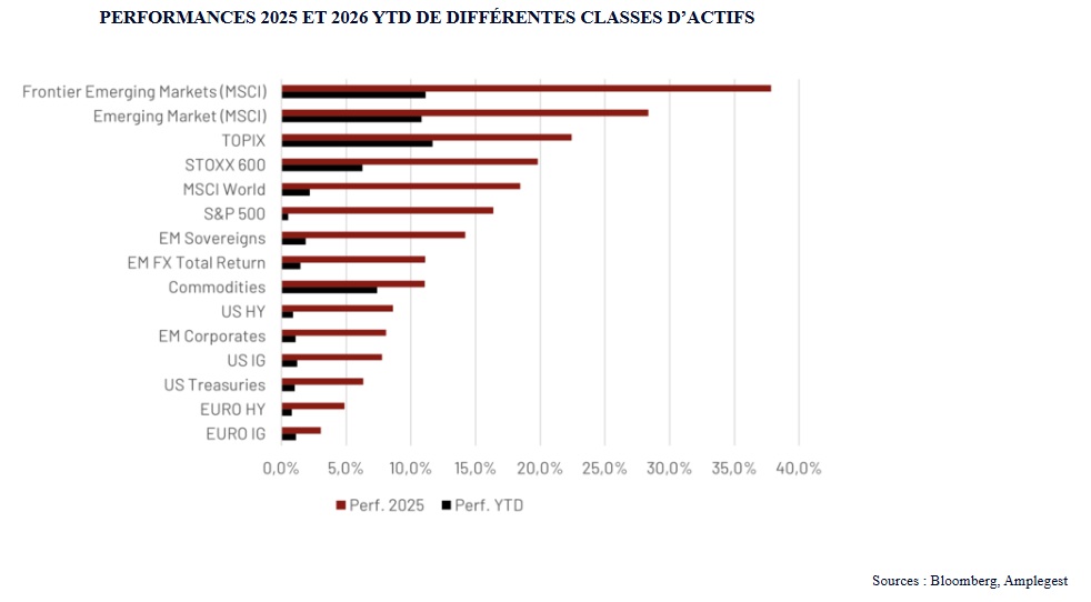 De sorte que l’on peut d’une part être tenté d’avancer que nous traversons, plutôt qu’une remise en cause de l’hégémonie de la devise américaine, un changement de régime dans son évolution – ou pour reprendre les commentaires de certains acteurs de marché, une érosion de la prime que cette hégémonie lui avait conférée sur le marché des changes. Et partant, s’intéresser aux perspectives de l’une des classes d’actifs les plus susceptibles de bénéficier d’un affaiblissement (durable) de l’USD : les émergents. Ce d’autant plus que cette classe d’actifs, tous supports confondus, a largement performé en 2025 et en ce début d’année 2026 (cf. graphique ci-dessous).