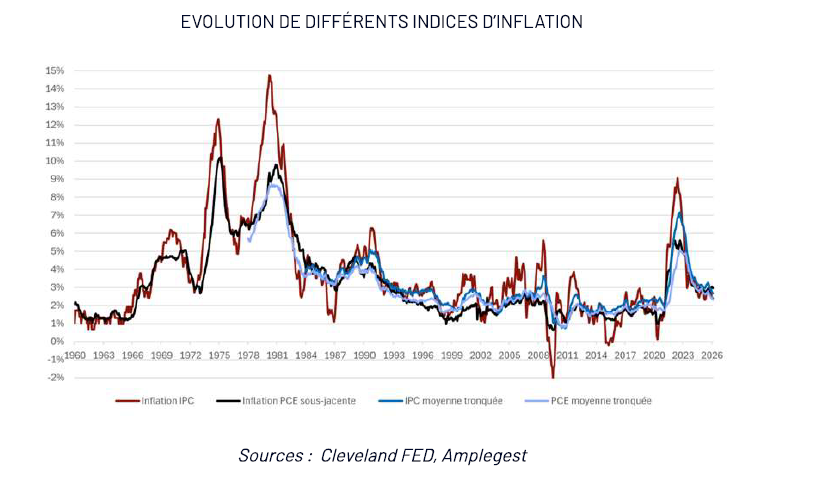 Comment ignorer en effet que la critique des statistiques d’inflation à laquelle il s’est employé pour mieux indiquer son ambition de développer un nouveau projet de grande envergure de construction d’une nouvelle enquête portant sur 1Md de prix différents, passe non seulement sous silence les travaux déjà entrepris en ce sens, par différentes institutions (au premier rang desquelles le BLS, soumis depuis le début du mandat du 47ème POTUS, à une pression budgétaire maximale), mais peut plus immédiatement faire partie intégrante d’une stratégie de promotion d’une définition plus lâche, de l’inflation et du ciblage d’inflation qui a sous-tendu la politique de la FED depuis des décennies (propre à permettre toutes les décisions hétérodoxes) ? Comment l’ignorer alors que Kevin Warsh s’est par ailleurs montré favorable à l’utilisation de cibles plus larges, et qu’il a indiqué préférer au « PCE Core » (i.e. excluant tous les éléments les plus volatils) qui avait jusqu’ici les faveurs des Gouverneurs de la FED (ou plus loin au CPI) – les indicateurs de moyenne tronquée/ajustée (des éléments les plus extrêmes) ou « trimmed-mean inflation measures » - aboutissant très régulièrement à une lecture d’inflation moins élevée que celle de ceux qu’ils sont censés remplacer ?