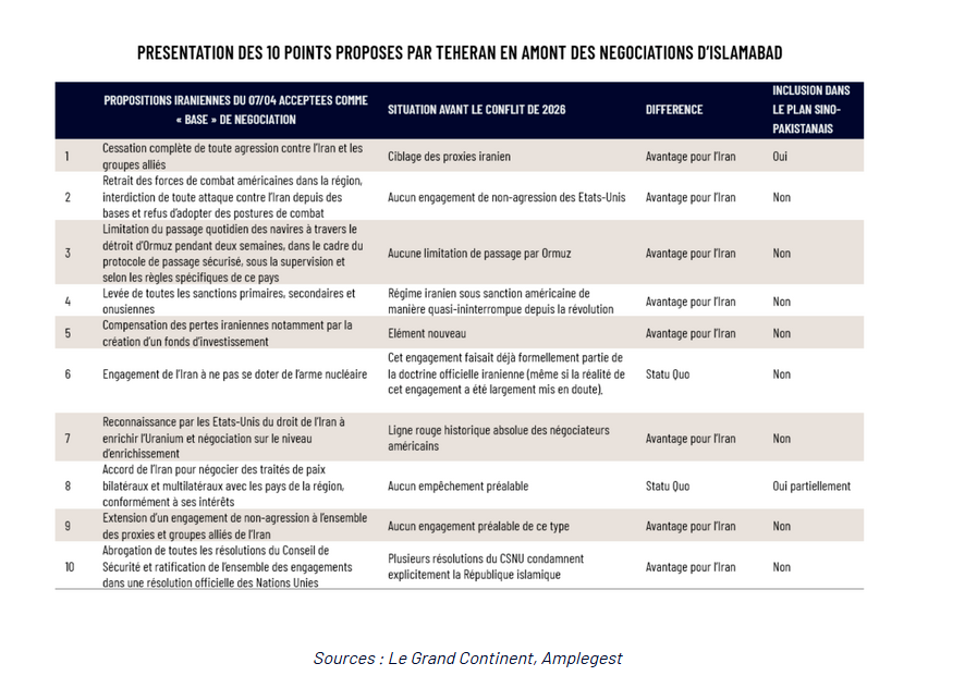 Car des dix points du plan iranien devenu l’espace d’un post, base de négociation acceptable, il était dès le soulagement passé, possible de constater le caractère maximaliste. Et sauf à imaginer que les Etats-Unis, acceptent de transiger sur un certain nombre de lignes rouges posées depuis des décennies (et jamais remises en cause en dépit des changements de majorité), il était dès les premiers instants, clair que les chances de voir aboutir les négociations appelées à être entamées à Islamabad seraient des plus limitées – sauf à imaginer les Etats-Unis prêts à tout pour se retirer d’un conflit par eux déclenché, mais bien plus compliqué à circonscrire qu’ils ne l’avaient manifestement envisagé.
