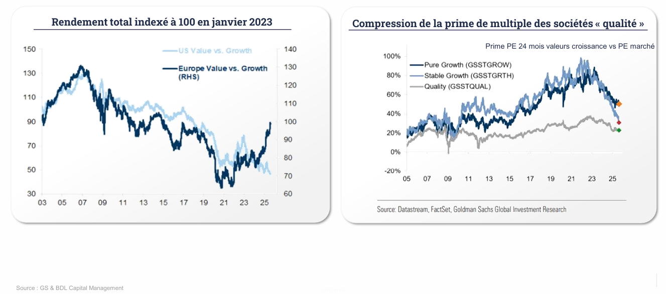 La compression de la prime des sociétés « qualité » illustre ce changement de régime : les investisseurs redeviennent plus exigeants sur les niveaux de valorisation.