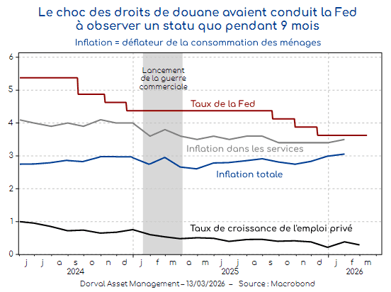 Les chocs stagflationnistes sont particulièrement désagréables. Ils provoquent des révisions à la baisse de la croissance, mais à la hausse pour l’inflation, ce qui complique la tâche des banques centrales. Dernier exemple en date avant la crise en Iran, les droits de douane américains de 2025 avaient conduit la Réserve fédérale américaine à stopper son processus de baisse des taux pendant les neuf premiers mois de l’année, alors même que le marché du travail s’affaiblissait (graphique 1). Au bout de ces neuf mois, elle a considéré que, malgré une inflation toujours supérieure à l’objectif des 2%, l’ensemble des pressions inflationnistes demeurait suffisamment sage pour reprendre prudemment le chemin de la normalisation des taux d’intérêt. Parmi ces indicateurs, le marché du travail, le prix des loyers, l’inflation dans les services, les pressions salariales et les anticipations d’inflation à moyen terme plaidaient pour une atténuation des risques inflationnistes.