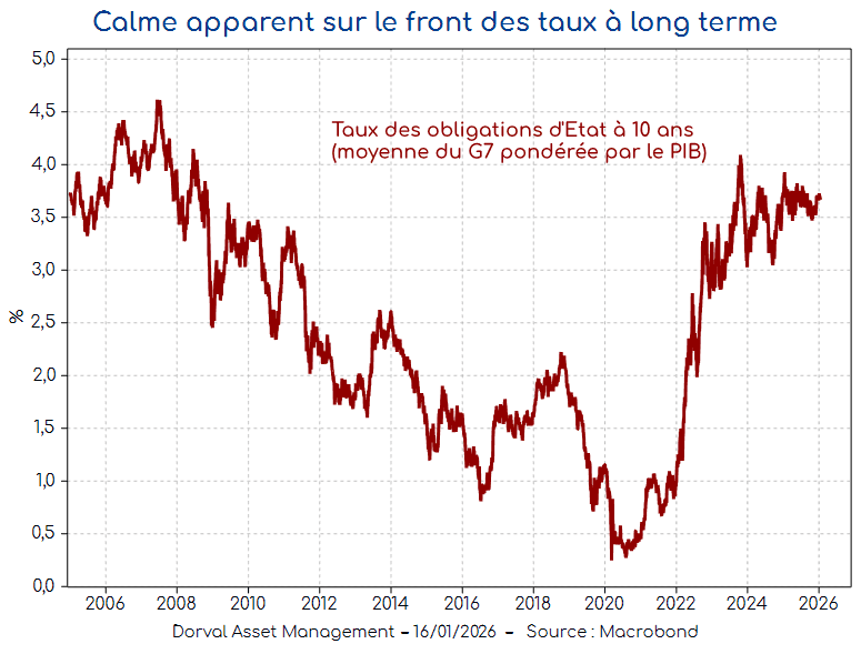 En moyenne pondérée par le PIB, les taux à 10 ans du G7 évoluent dans une marge assez étroite depuis plusieurs mois, entre 3,5% et 3,8% (graphique 1). En 2025, toutes maturités confondues, l’indice Bloomberg des obligations d’Etat dans le G7 aura grimpé de 3,5% (risque de change couvert), soit un petit plus que les taux monétaires.