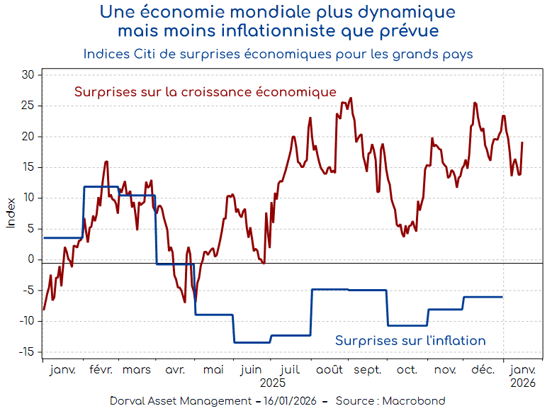 Devenus plus optimistes sur les perspectives économiques mondiales, il est certes logique que les investisseurs ne se précipitent pas sur les obligations d’Etat, qui sont plutôt des actifs refuges contre le risque de ralentissement économique. Les indicateurs montrent cependant que l’inflation reste inférieure aux attentes (graphique 3), ce qui est plutôt rassurant pour les marchés obligataires. Les derniers chiffres publiés aux Etats-Unis (+2,6% sur le CPI hors alimentation et énergie en décembre, malgré les droits de douane) sont même assez encourageants.
