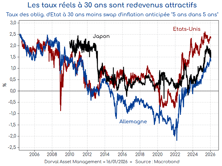 De plus, les primes de risque sur les obligations d’Etat sont aujourd’hui souvent élevées, ce qui plaide contre un diagnostic de complaisance. Les taux réels à 30 ans, ajustés des anticipations d’inflation, sont en effet vivement remontés, et sont même aujourd’hui attractifs dans une optique de moyen terme (graphique 4).