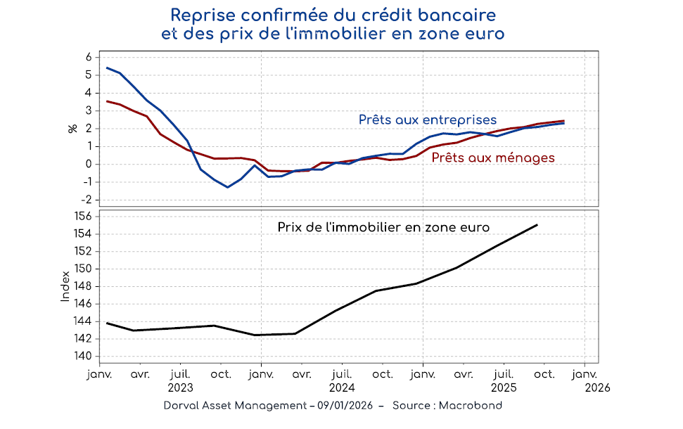 Ces dynamiques bancaires et obligataires inédites expliquent pourquoi la finance européenne se porte beaucoup mieux que son économie. Mais la confiance financière a aussi des conséquences économiques. L’une d’entre elles, la hausse de 13% de l’euro contre le dollar depuis un an, est négative pour les exportations européennes, d’autant qu’elle s’ajoute aux droits de douane américains. Un euro plus fort permet cependant d’accentuer la baisse des prix de l’énergie importée – le baril de pétrole est à 50 euros – et améliore le pouvoir d’achat de manière générale. De plus, le crédit bancaire confirme sa reprise (+2,4% sur un an en novembre 2025), et les prix de l’immobilier remontent (graphique 5).