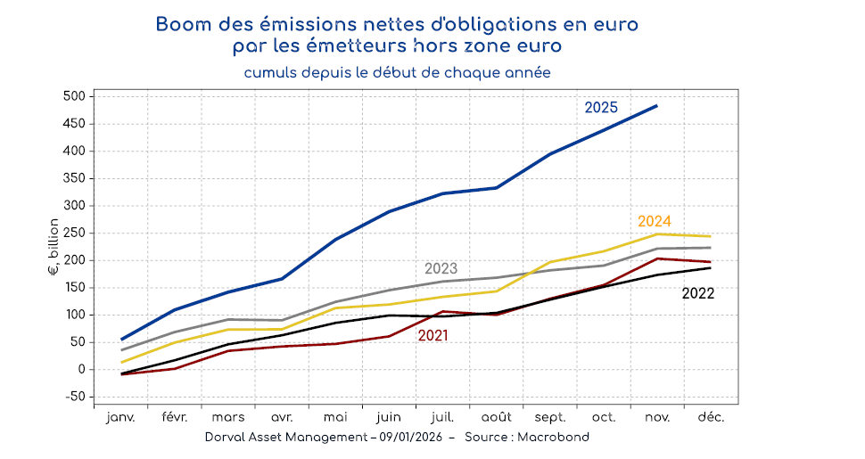 La confiance financière en Europe s’est enfin vue renforcée par la politique de Donald Trump, politique qui fragilise le statut du dollar. En recherche d’alternatives à un dollar à la fois cher et remis en question, certains investisseurs et émetteurs mondiaux ont largement utilisé l’euro pour se diversifier. En 2025, les émissions nettes d’obligations internationales en euro ont atteint près de 500 milliards d’euros, contre environ 200 milliards d’euros les années précédentes (graphique 4).