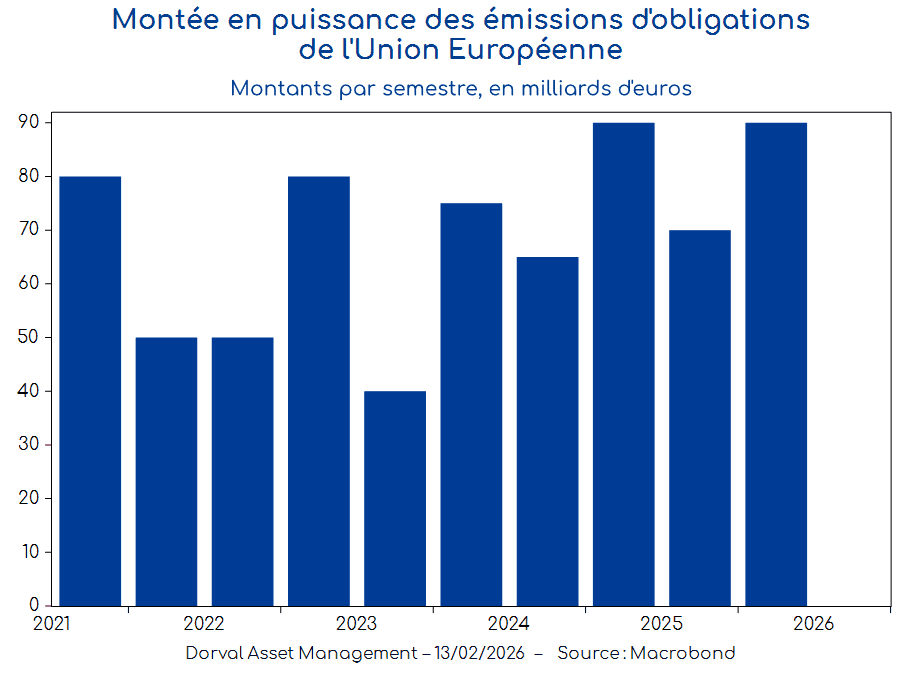 Un programme d’émission suffisamment intense et récurrent améliorerait la liquidité de ce marché. Certains économistes évoquent aussi la création d’une agence européenne de la dette qui consoliderait les émissions de toutes les institutions de l’UE, dont la Banque européenne d’investissement, qui porte un encours de €450 milliards (dont €250 milliards d’obligations en euros). Enfin, des initiatives sont en cours pour intégrer les obligations de l’UE dans les principaux indices obligataires souverains. Elles en sont aujourd’hui exclues en tant qu’obligations dites « supranationales ».