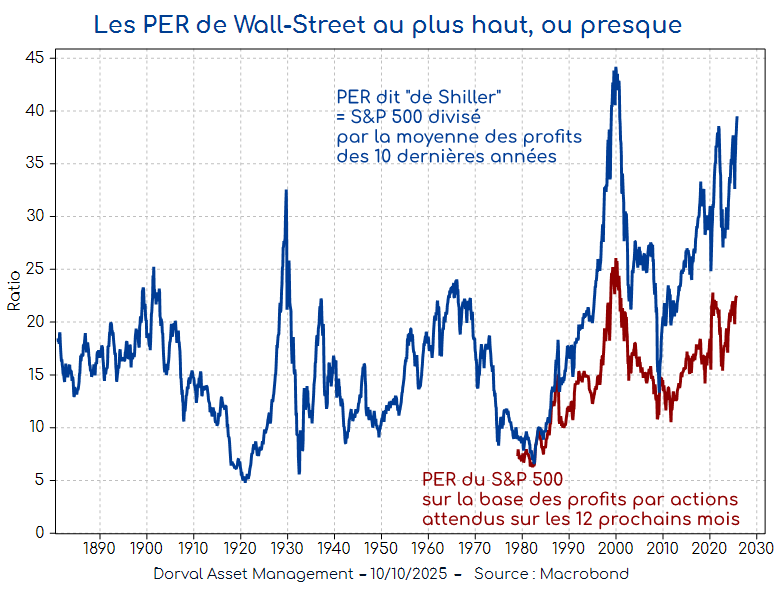 Ces niveaux de valorisation impliquent que la performance future des actions américaines sera nettement moins bonne à l’avenir. Elle pourra cependant rester décente si les grands oligopoles – dont en particulier ceux de l’économie numérique – parviennent à maintenir leur profitabilité exceptionnelle. Mais le boom exponentiel des investissements en intelligence artificielle rend cette hypothèse plus fragile, ne serait-ce que par la dégradation des marges d’autofinancement que ces dépenses provoquent.