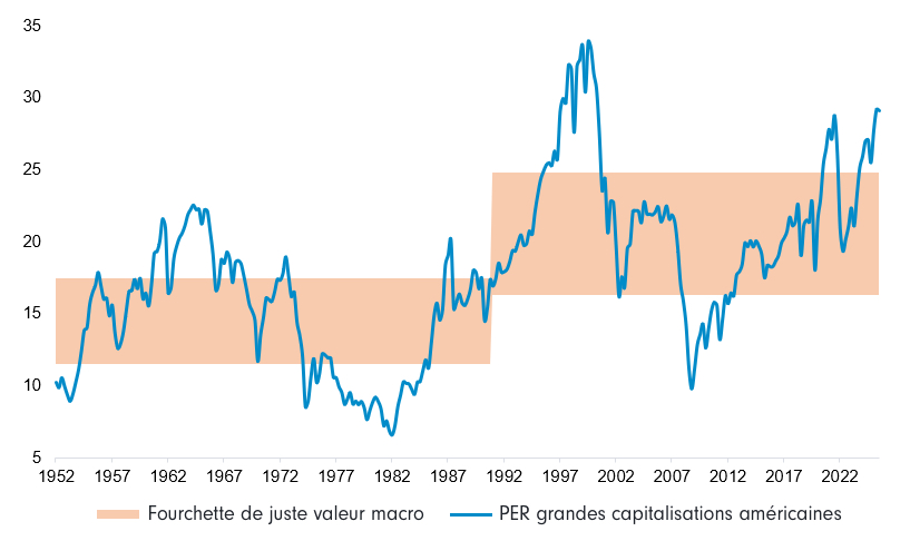 Source : base de données Prof. Shiller, Bloomberg, Refinitiv, calculs de Fidelity International. Au 31/12/2025. A titre d'illustration uniquement. Les chiffres sont basés sur des modèles propriétaires et reflètent l'opinion des professionnels de l'investissement de Fidelity International. Le "PER" est défini comme le PER (ratio cours/bénéfices) ajusté à l'inflation en utilisant le BPA sur 5 ans ; la "juste valeur" est le PER en fonction du rendement réel à 10 ans défini comme dans Shiller et al. (2020), de la volatilité macroéconomique définie comme la moyenne mobile de l'écart type sur 5 ans de l'inflation et de la croissance du PIB réel, et de la croissance des bénéfices réels sur 5 ans. L'indice de référence utilisé est le S&P 500. L'intervalle de juste valeur est l'intervalle de 1σ autour de la moyenne.