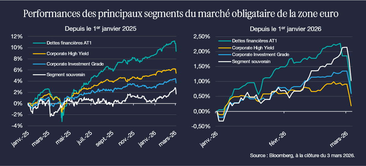 Cette baisse reste néanmoins mesurée au regard du solide parcours observé au cours des derniers mois. Au point que tous les segments de marché continuaient d’afficher à la clôture du 3 mars une performance positive depuis le début de l’année 2026 pour les titres libellés en euro : +1,0% pour le segment souverain, +0,6% pour le crédit Investment Grade, +0,2% pour le High Yield et +0,6% pour les dettes subordonnées financières AT1.