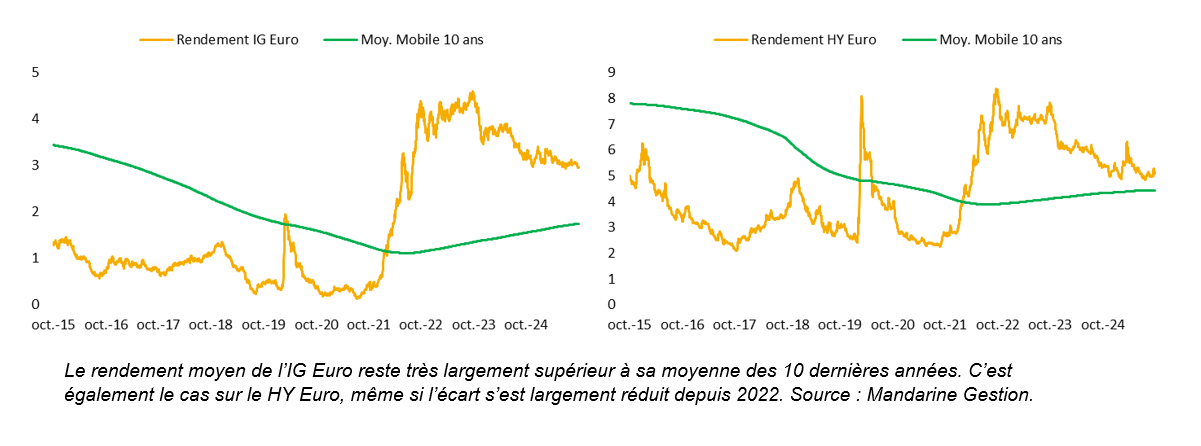 Cette dynamique ne semble pas devoir s’essouffler à court ou moyen terme : les flux d'investissement restent concentrés sur la recherche de rendement, avec l’Euro Investment Grade offrant 3,0 % et l’Euro High Yield 5,0 %. Ces niveaux demeurent nettement supérieurs à leurs moyennes historiques et conservent une prime attractive par rapport aux fonds monétaires, désormais sous les 2 % en Europe.
