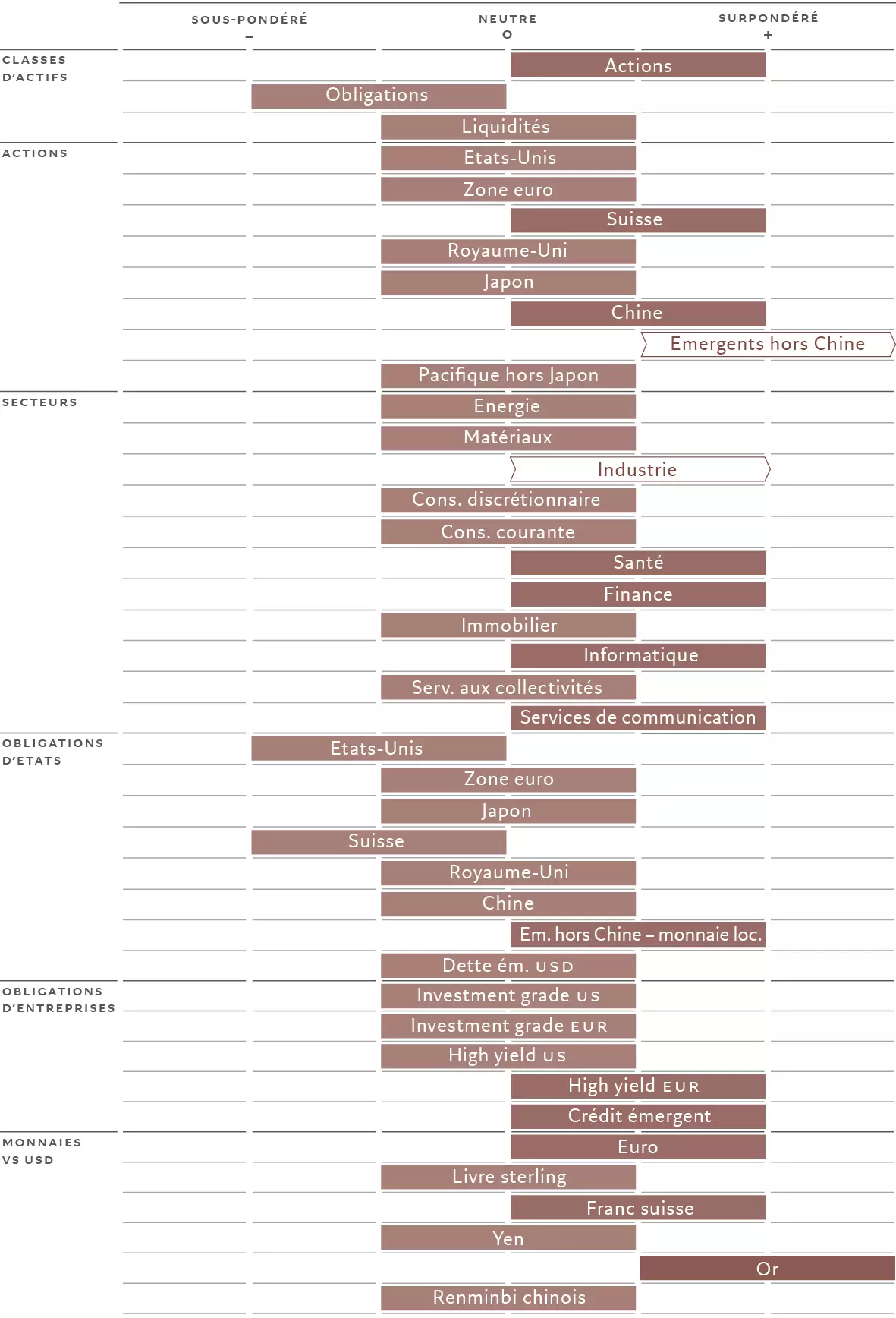 Compte tenu du maintien de mesures de relance monétaire et budgétaire dans le monde entier ainsi que de la perspective d’un assouplissement des réglementations sur les entreprises aux États-Unis, les actions restent une classe d’actifs attrayante. Néanmoins, ce sont les actions des marchés émergents qui présentent les plus grandes opportunités. Nous avons augmenté notre exposition aux actions des marchés émergents hors Chine et maintenons également une allocation en actions chinoises supérieure à celle de l’indice de référence.
